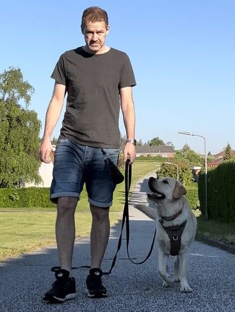 Jeg har selv fulgt træningsprogrammet “Den gode gåtur” med min skønne labrador Enzo. Her er han på en tur med mig i Aalborg og han er ved at blive rigtig god til at følge mig, selv i nye omgivelser med mange forstyrrelser.